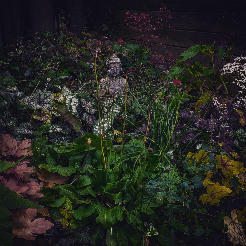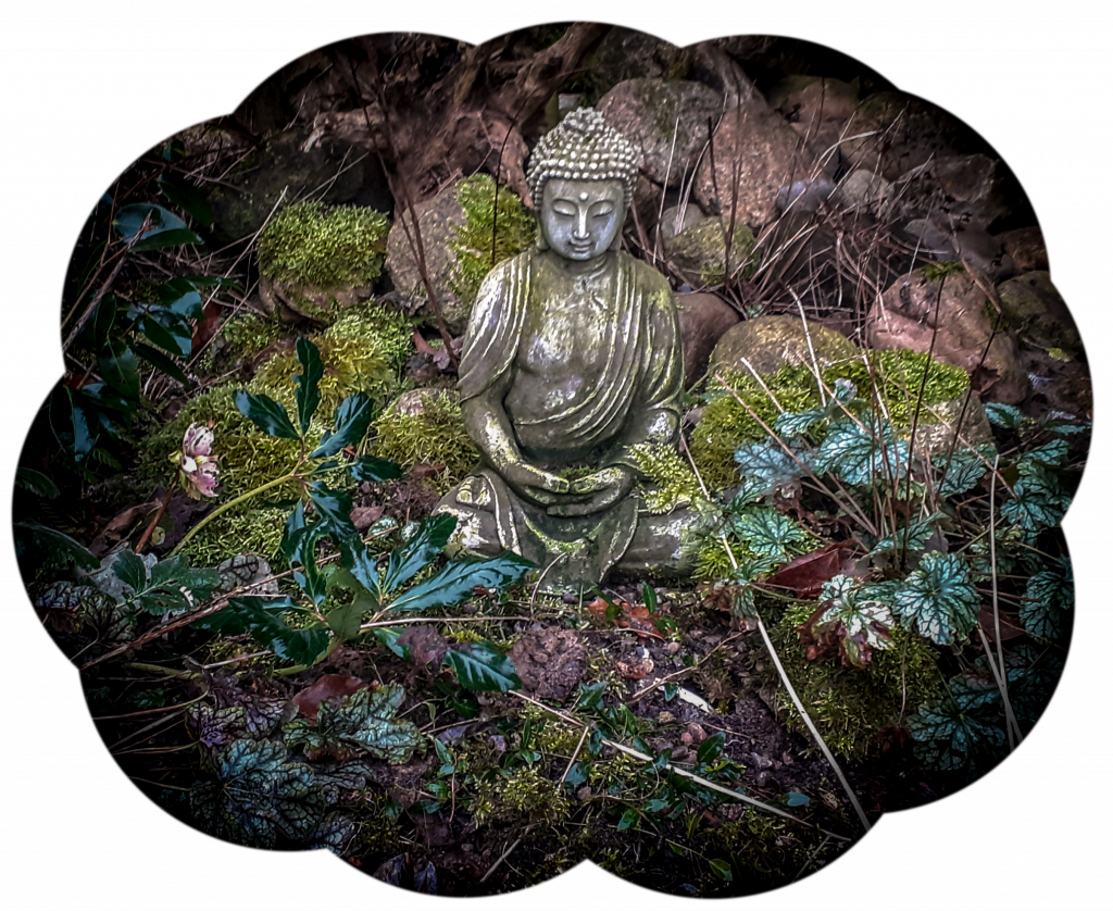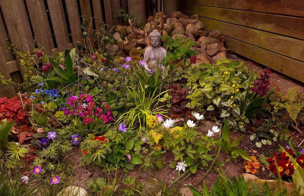 Mit Siebzehn Jahren habe ich die Bücher von Hermann Hesse verschlungen, besonders liebte ich „Demian“, den „Steppenwolf“ und ganz besonders verehrte ich das Buch „Siddhartha“. Deswegen schenkte mir, zu meinem achtzehnten Geburtstag, mein Onkel Harald eine Buddha Statue. Seitdem ist viel Zeit verstrichen. Der schwere indische Steinguss Prinz zog mit mir von Wohnung zu Wohnung und über die Grenzen NRWs hinaus. Seit 2021 wohnt er in unserem schönen Schattenbeet.